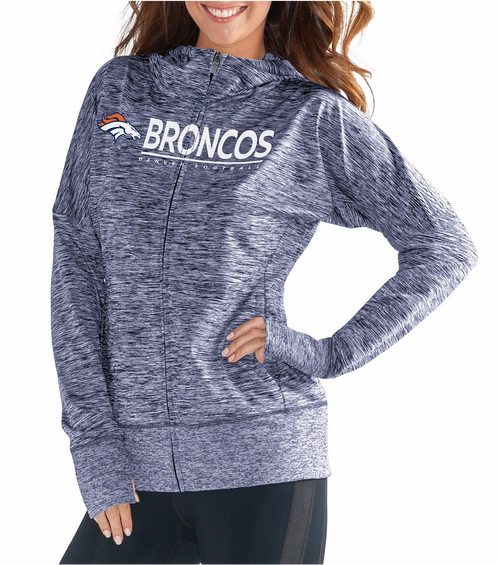 Ladies, keep warm this football season with this Denver Broncos Ladies Receiver Spaced Dye Full-Zip Hooded Sweatshirt from G-III 4Her! This sweatshirt is all gray and features "Broncos" written across the chest. 88% Polyester. 12% Spandex.